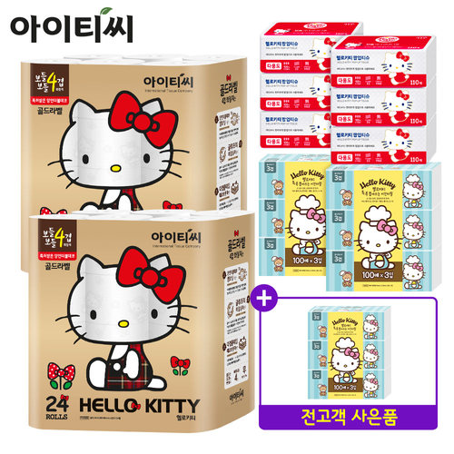 [윈터패키지]헬로키티 골드라벨4겹 화장지24롤2팩+ 팝업티슈6팩+키친타올6팩