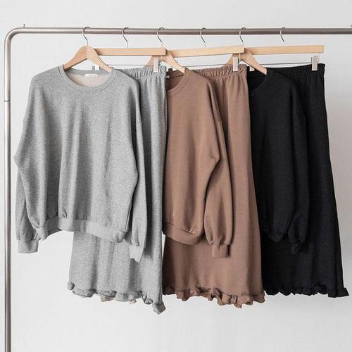 [옷자락]여성 오버사이즈 가을 맨투맨과 프릴 롱스커트 세트 빅사이즈
