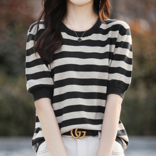 나바바 / NK2239 캐주얼 단가라 5부 라운드넥 니트 티셔츠