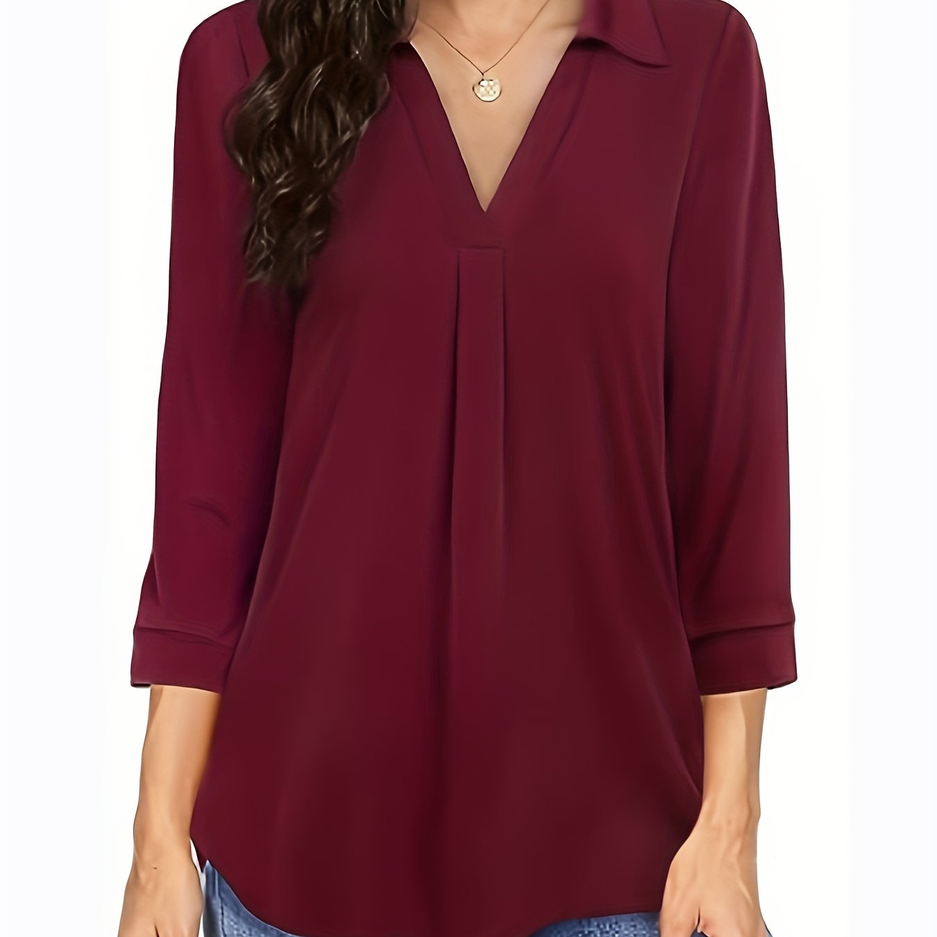 TEMU 플러스 사이즈 여성용 우아한 버건디 V넥 블라우스 - 3/4 소매 루즈핏 셔츠, 가슴 주름 장식, 세탁기 사용 가능 사계절 캐주얼 & 포멀 탑, 부드러운 질감