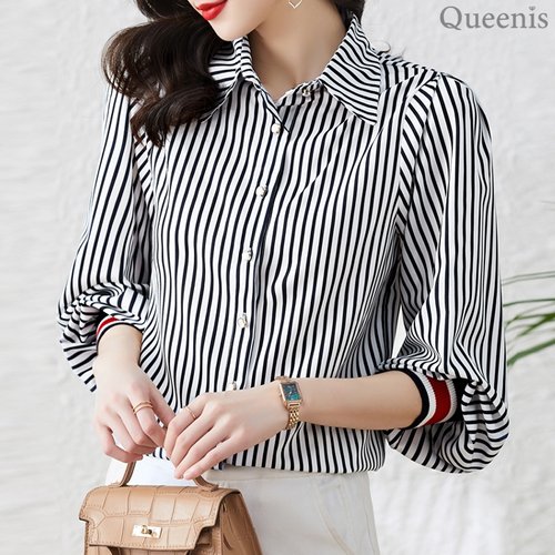 [퀸이즈] [~88까지]렌디 스트라이프 퍼프 소매 블라우스/셔츠