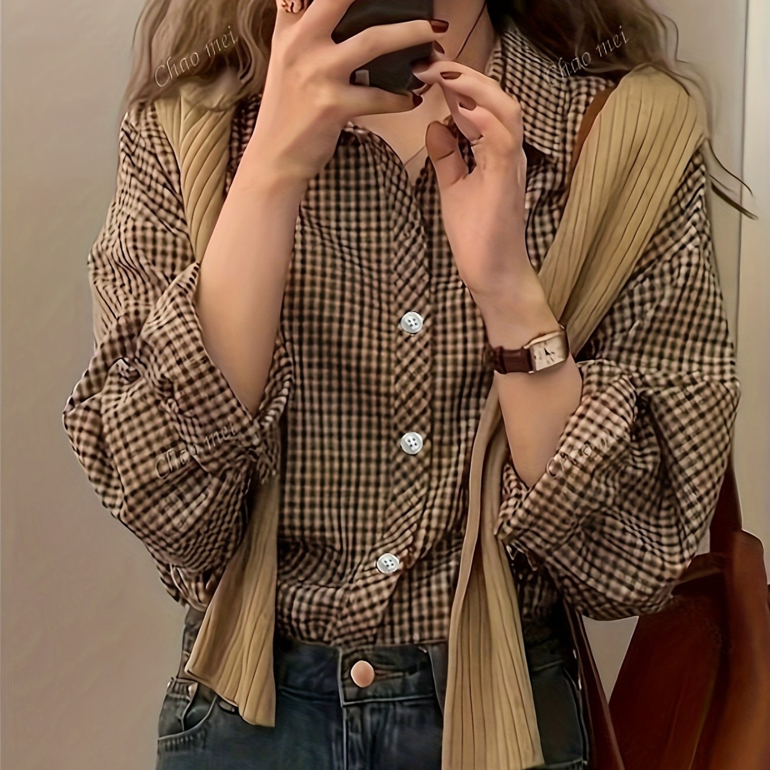 TEMU 여성 빈티지 체크 셔츠 - 클래식 칼라와 버튼 디자인, 봄/가을 출퇴근, 캐주얼 외출 및 다양한 레저 활동에 적합한 루즈핏.