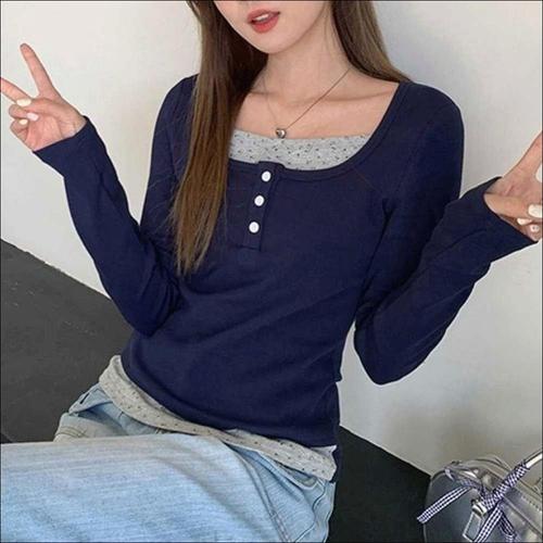 여성 레이어드 버튼 긴팔 티셔츠 베이직 이너 두겹 U넥 WFKZVOU