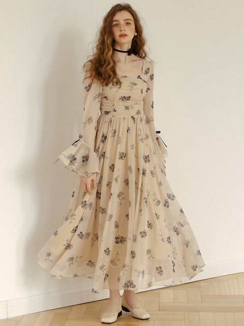 [던드롭] DD_Ink printed floral bell sleeve dress